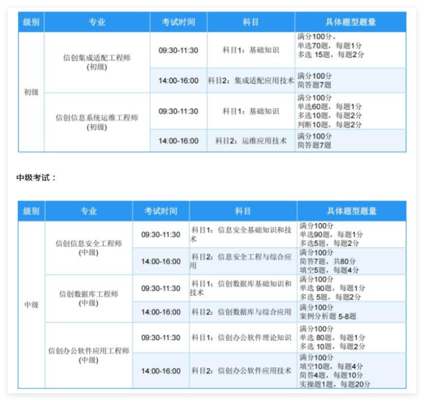 中级考试内容包括基础知识(120分钟)和应用技术(120分钟),总分为100分,及格分数为60分。