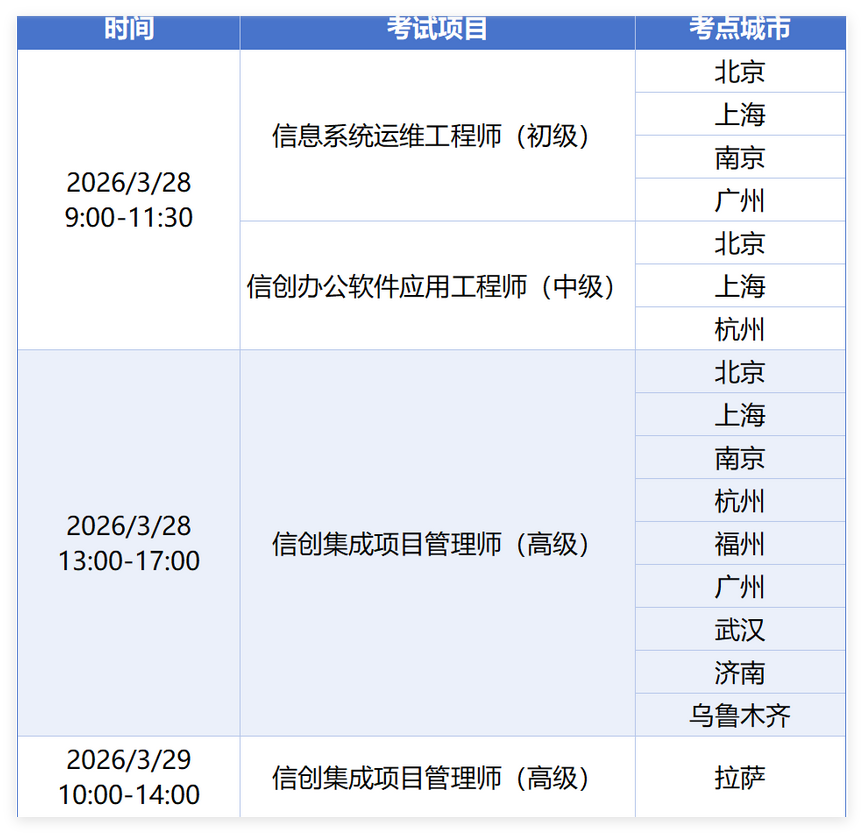 自2025年12月起,信创认证考试发生了重要变化——全面实施线下集中考试模式。这一举措标志着信创人才评价体系正向更加规范和严谨的方向发展,以确保考试的公平、公正和权威性。预计到2026年,这种线下考试模式将继续得到实施和巩固。最新的信创证书考试安排在3月28日和29日,考点城市包括北京、上海、南京、广州等,涉及的考试项目有信息系统运维工程师(初级)、信创办公软件应用工程师(中级)和信创集成项目管理师(高级)。具体信息请参见下图: